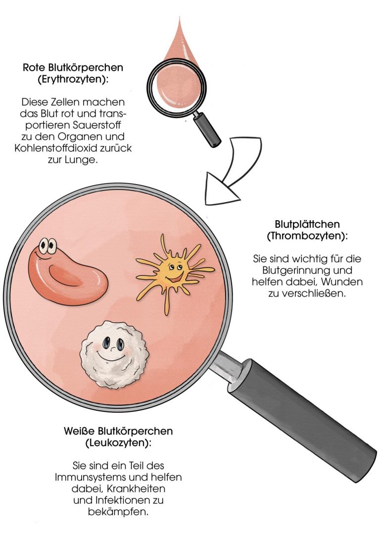Unser Körper ist wirklich ein kleines Wunderwerk! Und ihr könnt ihm helfen, indem ihr gesund esst und viel trinkt, damit euer Blut immer stark und gesund bleibt. Wenn ihr mal zur Ärztin oder zum Arzt geht und eine Blutprobe abgegeben wird, wisst ihr jetzt, warum das so wichtig ist.