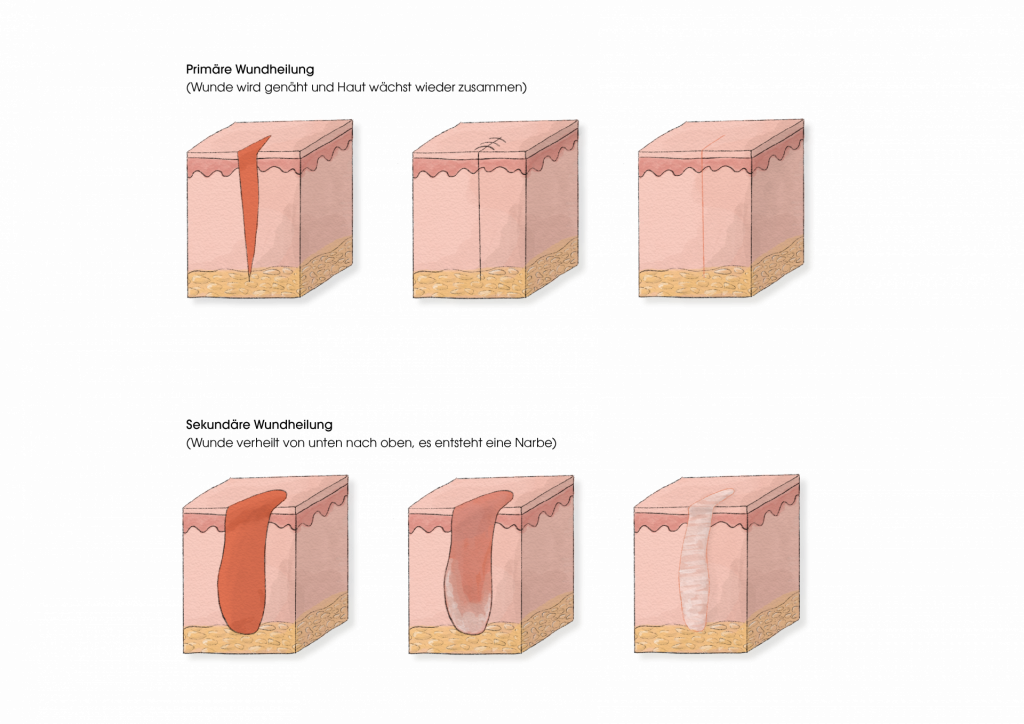 Wenn unsere Haut verletzt wird, merkt man sofort: „Oh, hier stimmt etwas nicht!“ Jetzt beginnt der Körper mit seiner Erste-Hilfe-Aktion, und je nachdem, wie tief die Wunde ist und wie schnell sie versorgt wird, kann sie auf unterschiedliche Weise heilen.